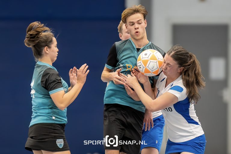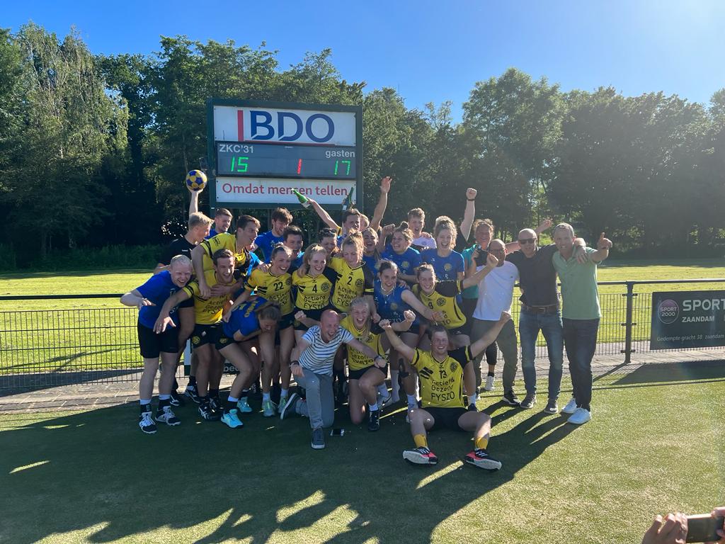 In de 2e helft was het wederom ZKV wat als eerste wist te scoren maar Die Haghe scoorde meteen weer terug. Wat er toen gebeurde weet ik nu nog niet maar de volgende 10 minuten lukte er aan Haagse zijde vrijwel niets meer en ZKV, wat inmiddels 2 heren van vak hadden gewisseld, begon ineens te scoren en kwam terug naar 11-13 en begon er weer in te geloven. Ook een time-out van coach Tim Abbenhuis (DH) kon dit niet voorkomen. Dus probeerde hij dit met een wissel maar moest toezien dat het zelfs 13-13 werd en bracht toen Kirsten Koert in en dat bleek de ommekeer in de wedstrijd. Haar eerste schot viel direct binnen en was de ban na 18 minuten gebroken. ZKV kwam nog wel terug naar 14-14. Kirsten er weer uit en bij het volgende signaal naar het andere aanvalsvak en jawel zij kreeg een strafworp mee en ronde deze ondanks de spanning koelbloedig af 14-15. Vlak daarna bracht Die Haghe het verschil weer naar 2 omdat Jiska Rietveld een korte kans zich niet liet ontnemen dus was het 14-16 met nog zo’n 4 minuten te gaan. ZKV gaf het niet op en scoorde de eerstvolgende aanval 15-16. Mike moest toen gedacht hebben, dat kunnen wij ook en scoorde de 15-17 met nog 2.30 min te gaan. De scheidsrechter, welke vooral de 2e helft wel erg warrig floot, besloot ZKV een strafworp toe te kennen. Iedereen hield zijn adem in en een gejuich op de bank en de supporters steeg op toen deze gemist werd. Die Haghe speelde de wedstrijd nu rustig uit en na het laatste fluitsignaal werden de champagneflessen ontkurkt en werd het feest met de supporters gevierd.