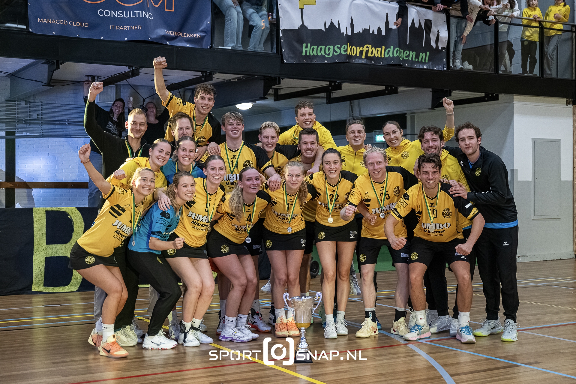 De Haagse Korfbaldagen Had een mooi affiche met de finale HK/OK tussen Die Haghe 1 en KVS 1. Een paar dagen eerder werd het in de poulefase nog gelijkspel dus de verwachtingen waren hoog gespannen. Maar na een bliksemstart van Die Haghe werd direct duidelijk hoe de kaarten geschut waren; Die Haghe schoot loepzuiver en KVS mistte de rebound. Na een minuut of 10 spelen hadden de Kanaries een voorsprong van 6-2 op de Supervissen, bij rust al 14-7. De 2e helft gaf geen ander beeld, het lukte KVS bijna niet om tot scoren te komen en Die Haghe liep steeds verder uit. Met een eindstand van 26-11 pakten de Kanaries terecht de begeerde beker en konden feest gaan vieren.