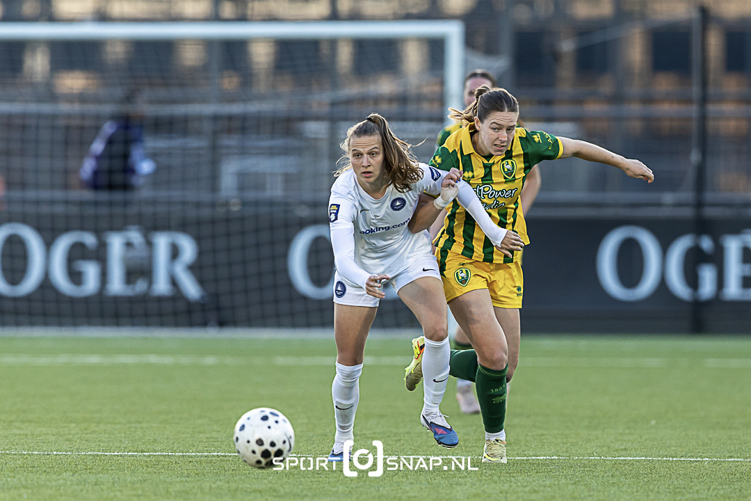 Geprikkeld door een dreigende degradatie begon het team van trainer Sandra van Tol vol overtuiging aan de wedstrijd. Het harde werken resulteerde al snel in een eerste treffer. In de 14e minuut scoorde Jill van den Ende de 0-1 met een snoeihard afstandsschot de 0-1. De hardwerkende van den Ende bezorgde de Amsterdamse defensie nogal wat zorgen. En dit was terecht want vijf minuten na de openingstreffer scoorde Floortje Bol de 0-2, eveneens een schot van grote afstand. Dominique Bruinenberg bracht vlak voor rust de stand nog terug naar 1-2 maar ADO Den Haag maakte een sterkere indruk en op slag van het laatste fluitsignaal wees arbiter Bjorn Kuiper resoluut naar de stip nadat Anne Van Egmond na een snelle uitbraak door de Amsterdamse goalie tegen het gras werd gewerkt. Floortje Bol schoot onberispelijk binnen 1-3. De grote blijdschap na afloop was gezien het moeilijke seizoen begrijpelijk. Volgende wedstrijd is op 29 maart om 16.45 uur in het Werktalent Stadion. Tegenstander is dan Excelsior.