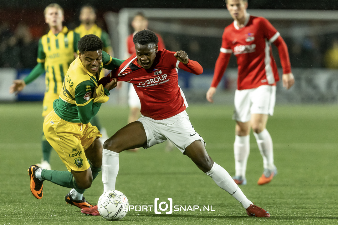Onder bizarre omstandigheden had ADO Den Haag in Wijdewormer weinig moeite met Jong AZ en bleef het ongeslagen. Door de 4-0 winst pakte de ploeg van Robin Peter de eerste periodetitel van het seizoen. Toch wil hij hier niet teveel aandacht op leggen want een goede voorzetting gedurende het seizoen is belangrijker met als doel de rechtstreekse promotie naar de eredivisie. Twee spelers moesten al vroeg in de wedstrijd het veld geblesseerd verlaten. Evan Rottier scoorde na aangeven van Jari Vlak na acht minuten de openingstreffer. Twee minuten later moest Nigel Thomas het veld verlaten en vijf minuten later moest Ilaijh de Ruijter ook een brancard richting de kleedkamer. Na rust leek de gelijkmaker in de lucht te hangen totdat de ingebrachte Daryl van Mieghem een einde maakte aan die droom van Jong AZ. Met een afstandsschot schoot hij de bal prachtig in de kruising en liet de Alkmaarse doelman kansloos. Het publiek ging los en scandeerde lang de naam van Daryl. De 3-0 kwam van de voet van Reischl en ook Cameron Peupion pikte zijn doelpunt mee (4-0). Het succesvolle ploeg van Robin Peter kreeg uit handen van Mark Wotte het bronzen schild overhandigd.